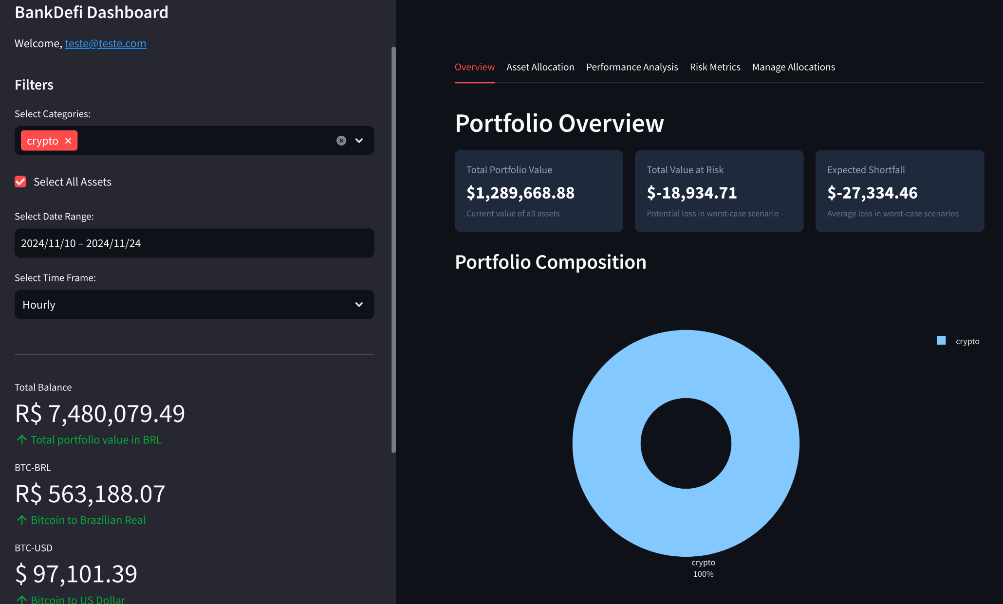 O BankDefi foi projetado para investidores de todos os níveis, oferecendo ferramentas intuitivas para gerenciar e analisar sua carteira, seja no DeFi ou nos mercados tradicionais.